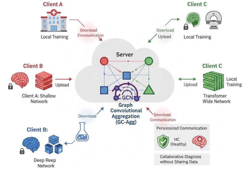 This work proposes a heterogeneous structured federated learning framework with graph convolutional aggregation for MRI-based mental disorder diagnosis, enabling effective collaboration across distributed medical institutions while preserving data privacy.