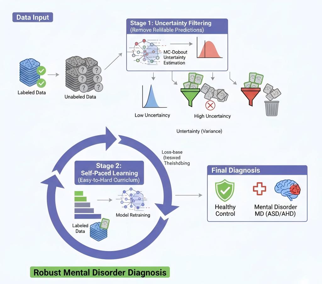 This work introduces a dual-stage pseudo-labeling method for diagnosing mental disorders on MRI scans, improving model performance through effective semi-supervised learning strategies.