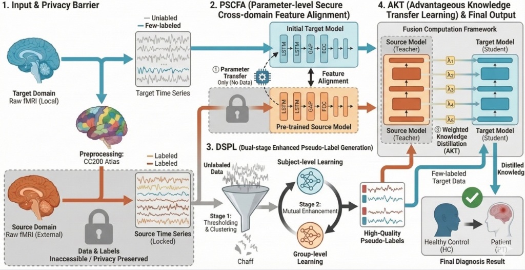 This work proposes a source-free semi-supervised transfer learning framework for diagnosing mental disorders using fMRI scans, addressing the challenges of limited labeled data and cross-site data privacy in medical imaging.