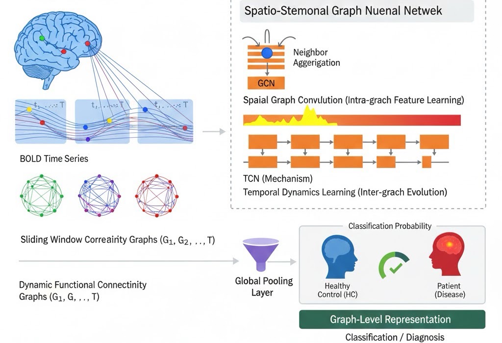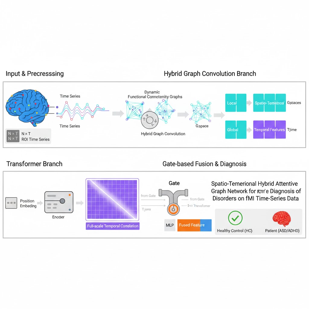 This work develops a spatio-temporal hybrid attentive graph network for diagnosing mental disorders from fMRI time-series data, combining graph neural networks with attention mechanisms to capture complex brain dynamics.