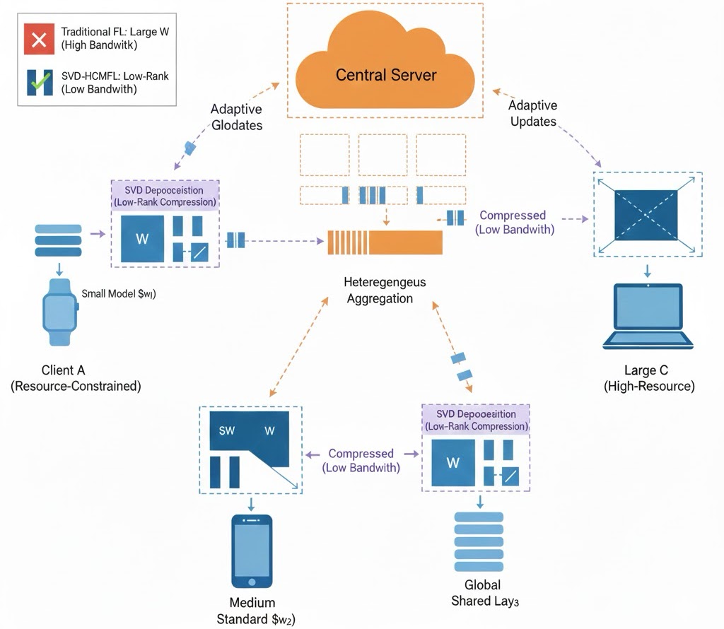 This work focuses on communication-efficient federated learning, proposing a novel framework to handle heterogeneous structured client models, reducing communication overhead while maintaining model performance in distributed learning scenarios.